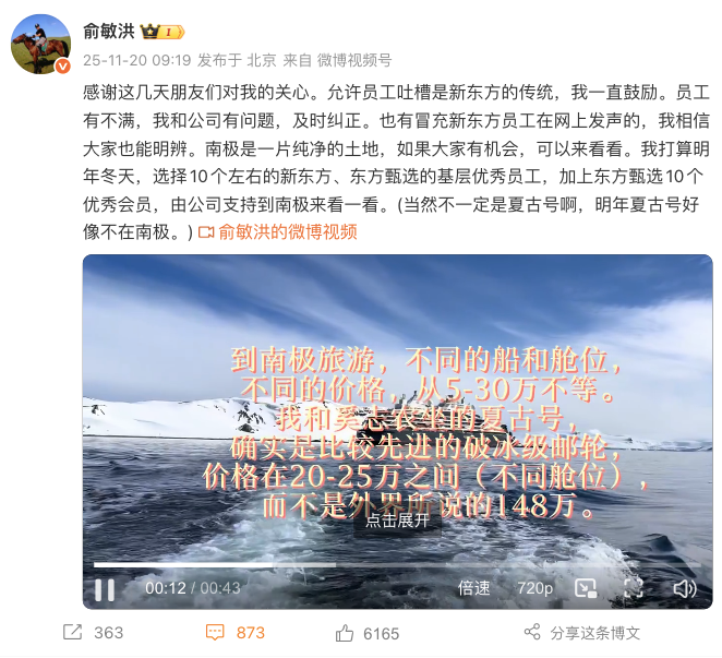 新东方创始人俞敏洪通过社交平台发文和视频,对近期的“南极游时发新东方全员信”引发的舆论纷扰进行了回应。