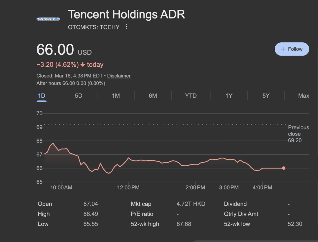 然而,与这份光鲜「成绩单」有点反差的,是财报发布后的第二天,腾讯股价下跌了接近 5 个点。